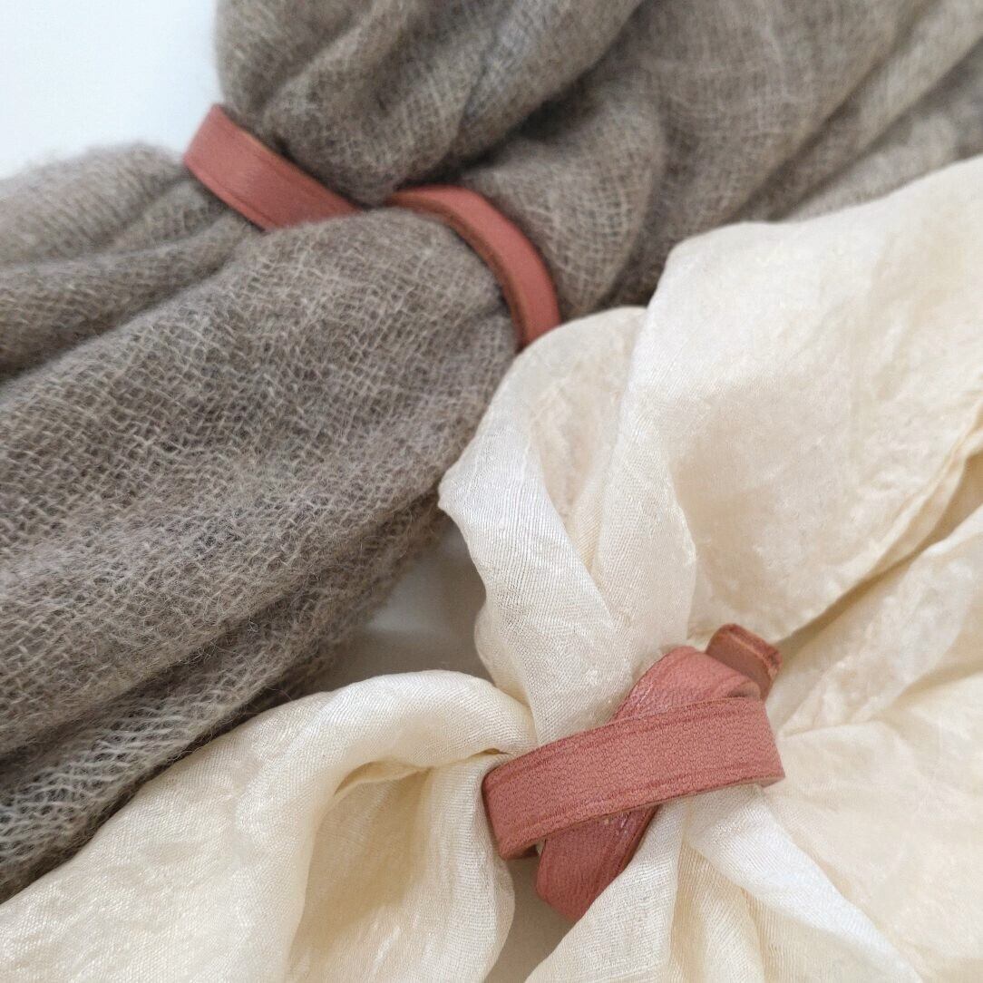 染色をしていないので、スカーフと内側の革が擦れて、革の色が大切なスカーフに移る心配を軽減しています。